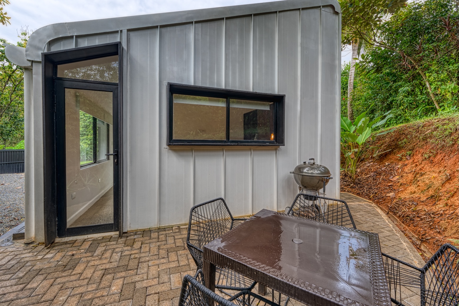 Inside, the high ceilings and sloping design create a feeling of spaciousness and light. The covered terrace invites you to relax, enjoy al fresco meals, or simply contemplate the tranquil surroundings.