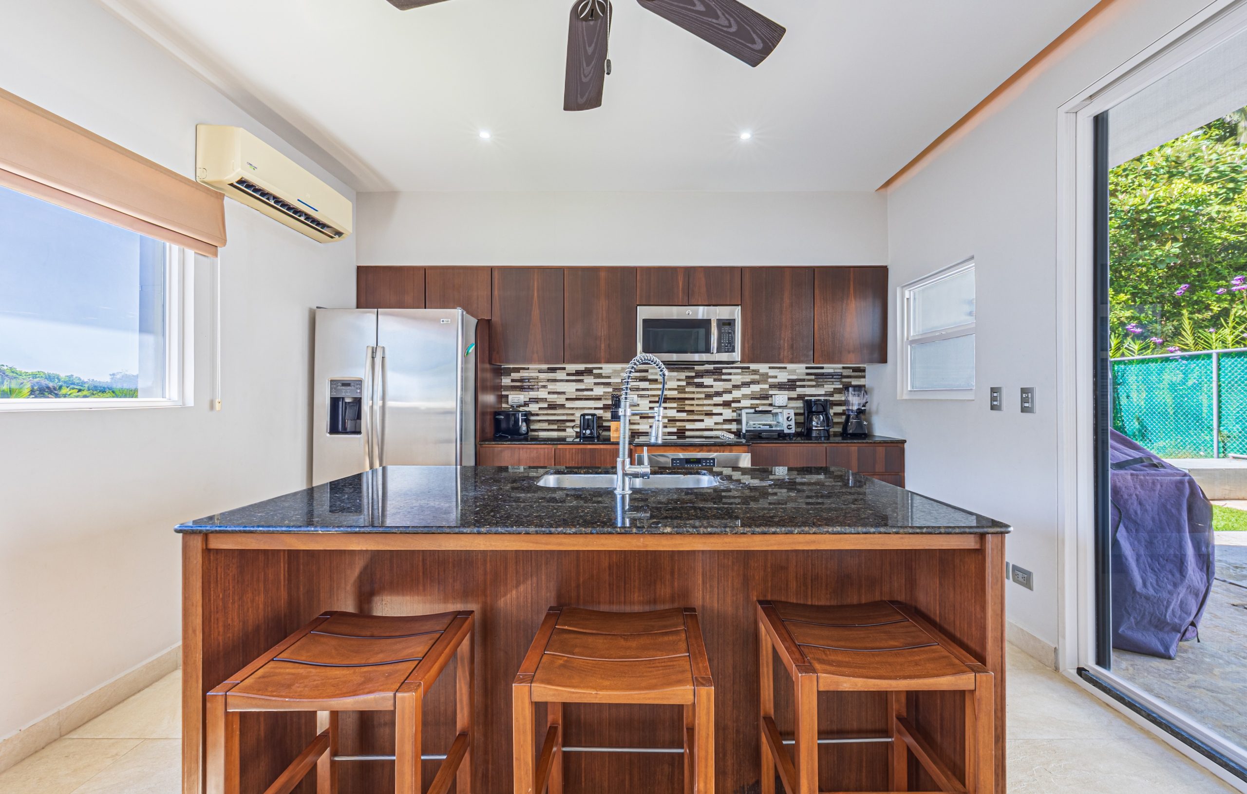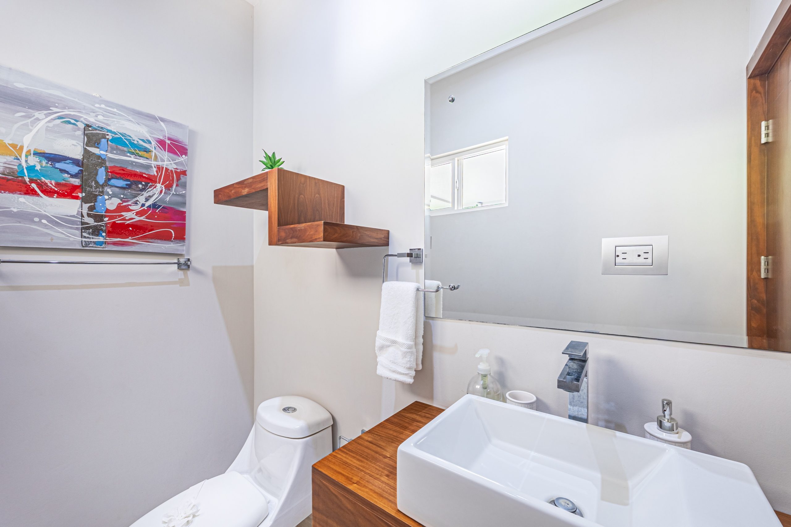 En la planta principal, la propiedad ofrece una amplia área social de concepto abierto que integra sala y comedor, iluminada naturalmente y realzada con sobres de cuarzo, ideal tanto para la vida diaria como para el entretenimiento. Cuenta con dos suites completamente amuebladas con finos muebles elaborados en madera local, medio baño para visitas en la planta baja y dos baños completos en el nivel superior.