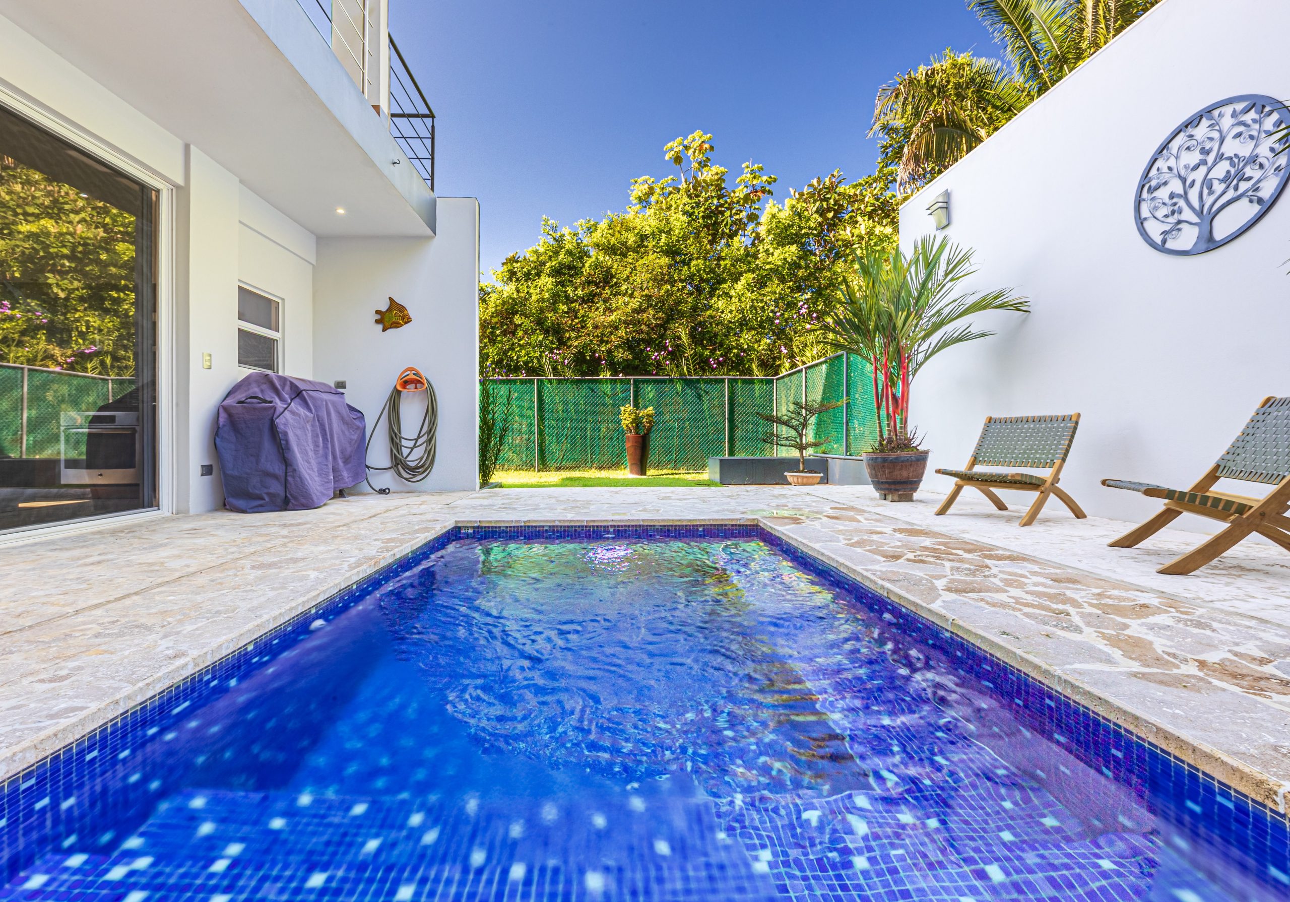 El área exterior invita al descanso con una piscina privada que se fusiona armoniosamente con un patio trasero totalmente cercado, rodeado de vistas al bosque que crean un ambiente tropical y tranquilo, perfecto para relajarse después de un día de playa.