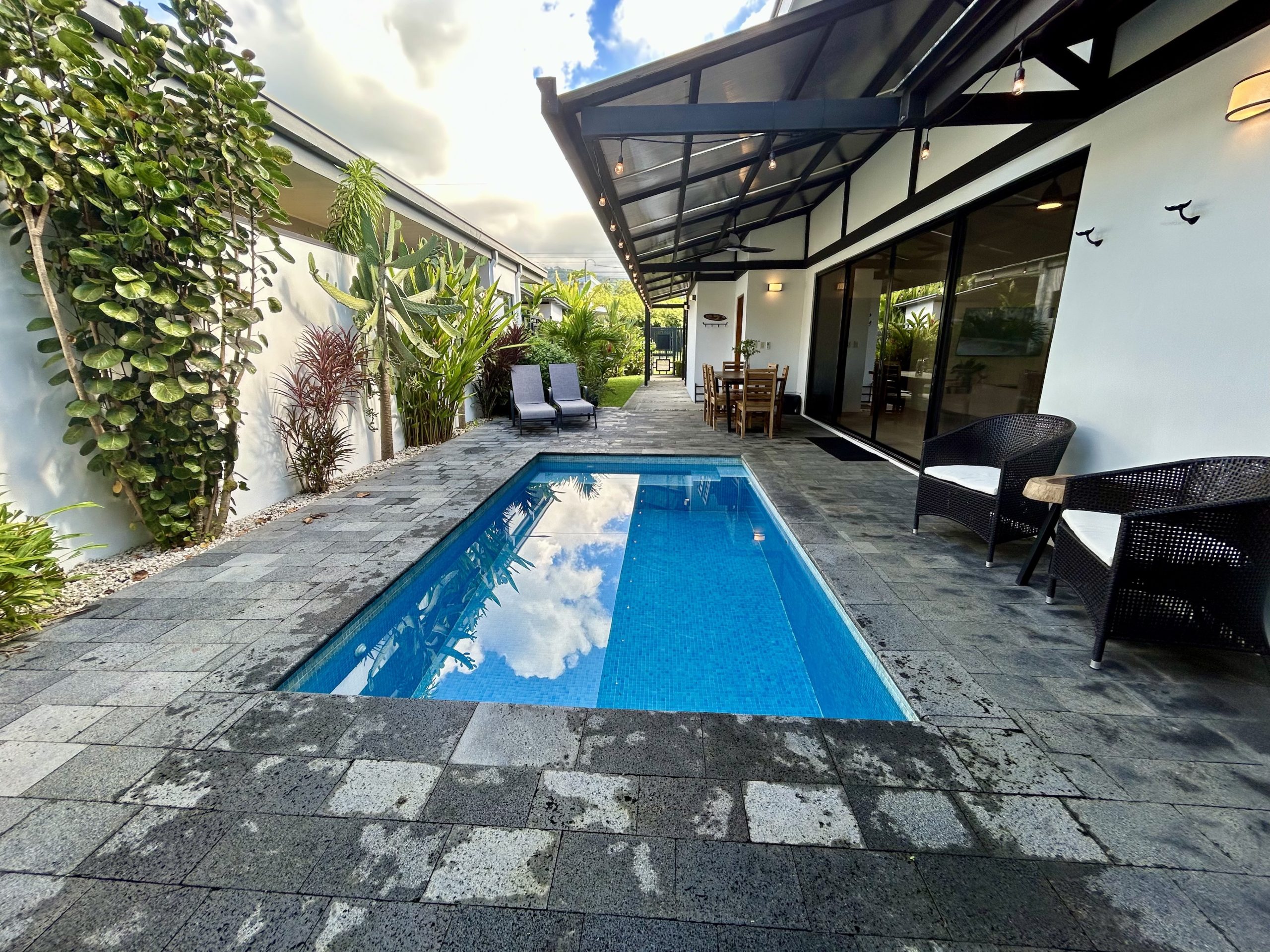 El área exterior destaca por su encantador jardín tropical, un porche techado y una piscina privada de tamaño ideal para disfrutar del clima de la zona. La casa se encuentra totalmente cerrada y cercada, garantizando privacidad y seguridad. Además, ofrece cochera techada para dos vehículos, bodega con control de clima y sistema de cámaras de seguridad en toda la propiedad.