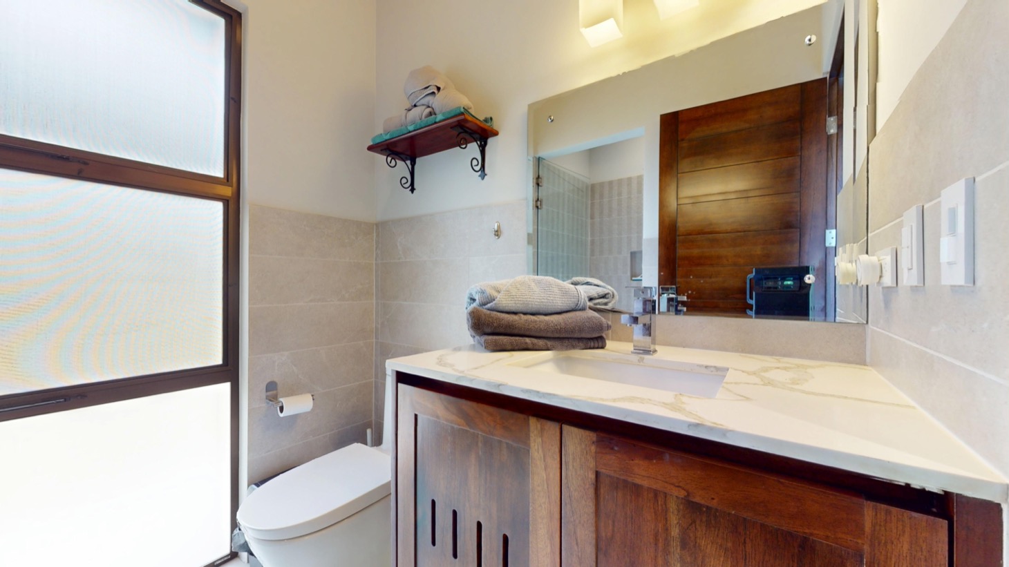 Upon entering, you are greeted by vaulted ceilings with an elegant finish in Costa Rican hardwood, which lend warmth and a sense of spaciousness. The furniture and cabinetry, also crafted from hardwood, provide coherence and an authentically natural touch to every corner. The open-concept design, along with expansive glass doors, allows light and breezes to flow freely, creating a bright, relaxed atmosphere perfect for both everyday living and entertaining.