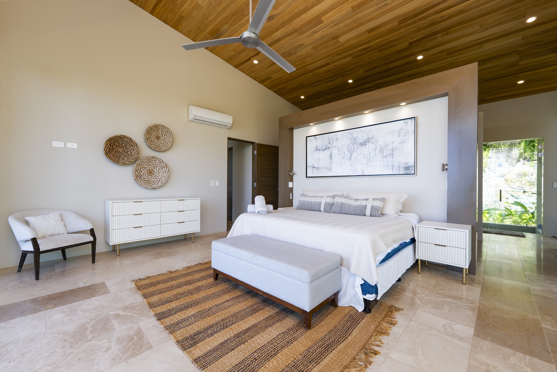 En el interior, encontrarás tres amplias habitaciones, todas con baño privado y acceso a patios que invitan a la tranquilidad y la reflexión. La suite principal es un verdadero refugio, equipada con una bañera profunda y una ducha al aire libre con efecto lluvia, ofreciendo vistas panorámicas al océano y a la selva tropical circundante. La elegante cocina de chef, totalmente equipada, se abre a un luminoso espacio diáfano que integra la sala de estar y el comedor, conectándose de manera fluida con una terraza cubierta, perfecta para recibir a invitados o relajarse con total privacidad. La piscina infinita parece flotar sobre la selva, brindando vistas privilegiadas de tucanes, monos aulladores y las migraciones estacionales de ballenas.