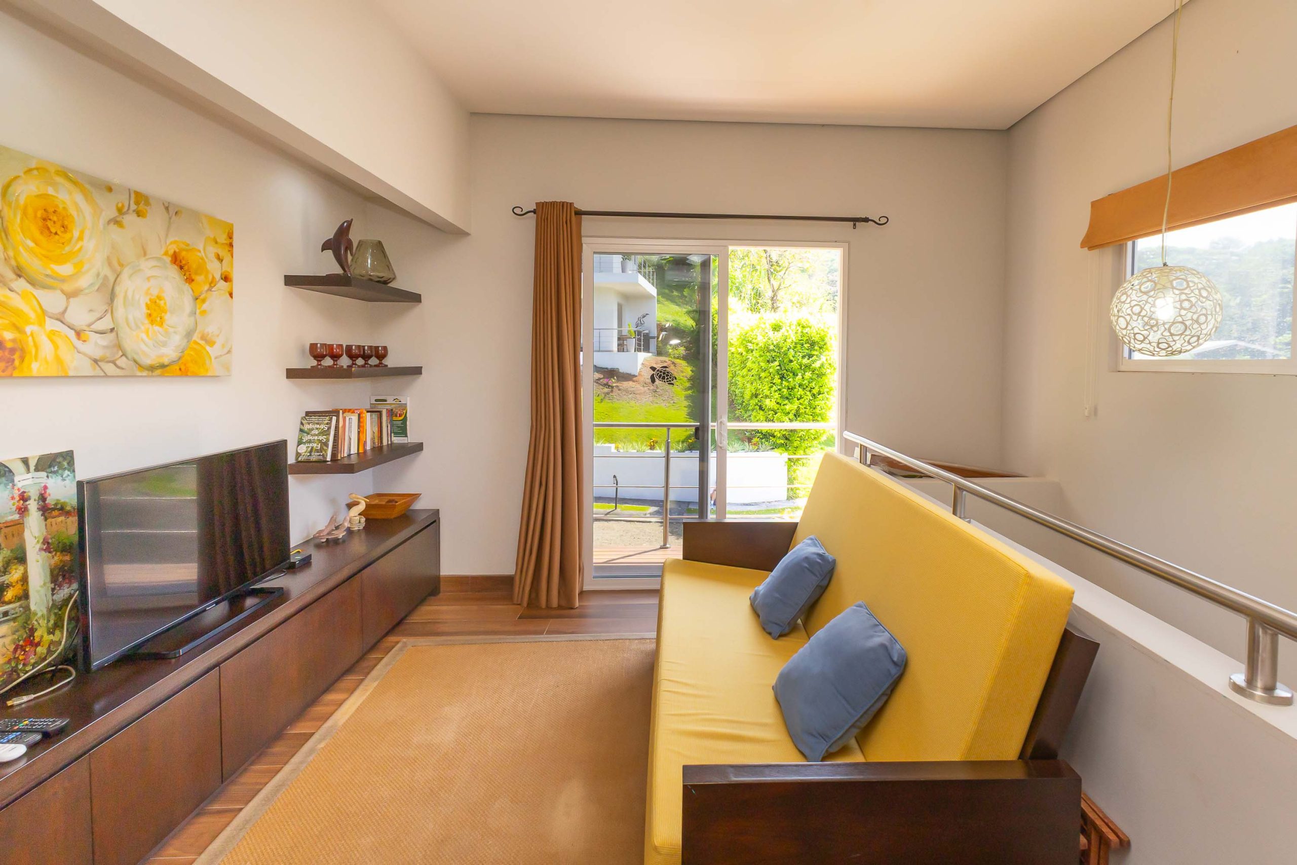 TV area with foldout bed on the upper level, perfect for guests