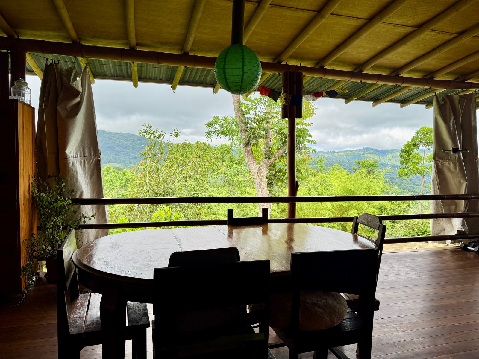 Amplia terraza techada de madera con espectaculares vistas a las montañas y un ambiente de total paz y privacidad