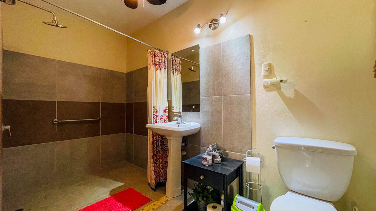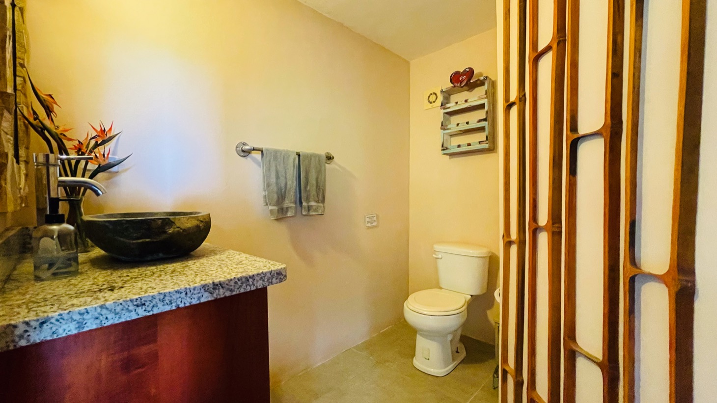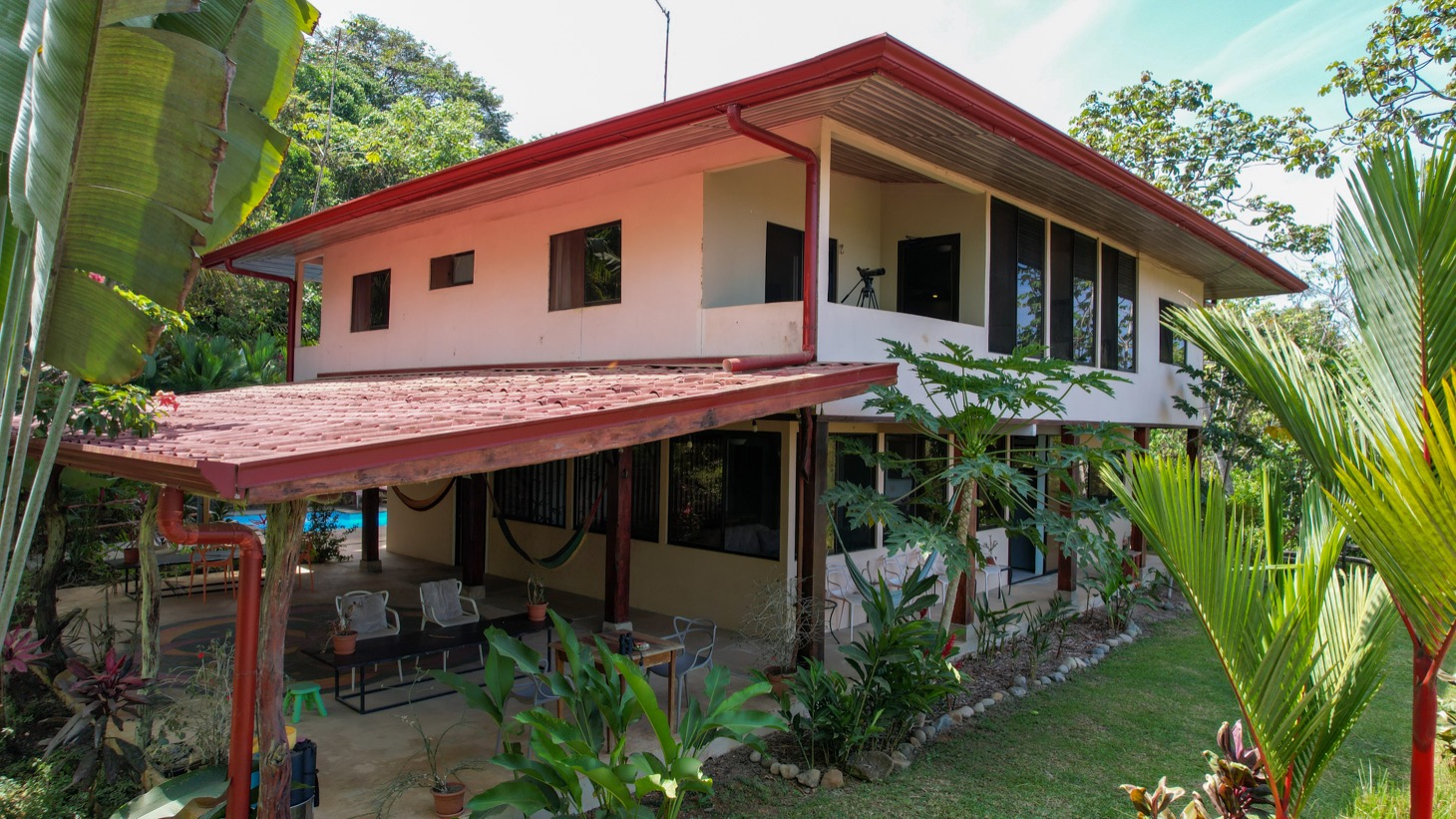 La edificación principal de dos niveles está cuidadosamente diseñada para combinar áreas de hospedaje con una residencia privada. En la planta baja se encuentra una acogedora zona común para huéspedes, que incluye sala y comedor de concepto abierto, una amplia cocina equipada con sobres de granito y electrodomésticos de gran tamaño, una espaciosa despensa, medio baño y área de lavandería. En el exterior se ubica una habitación adicional accesible para personas con discapacidad, con su propio baño. Una amplia terraza cubierta —ideal para yoga, meditación o relajación— permite disfrutar plenamente del entorno natural y la tranquilidad de la selva.