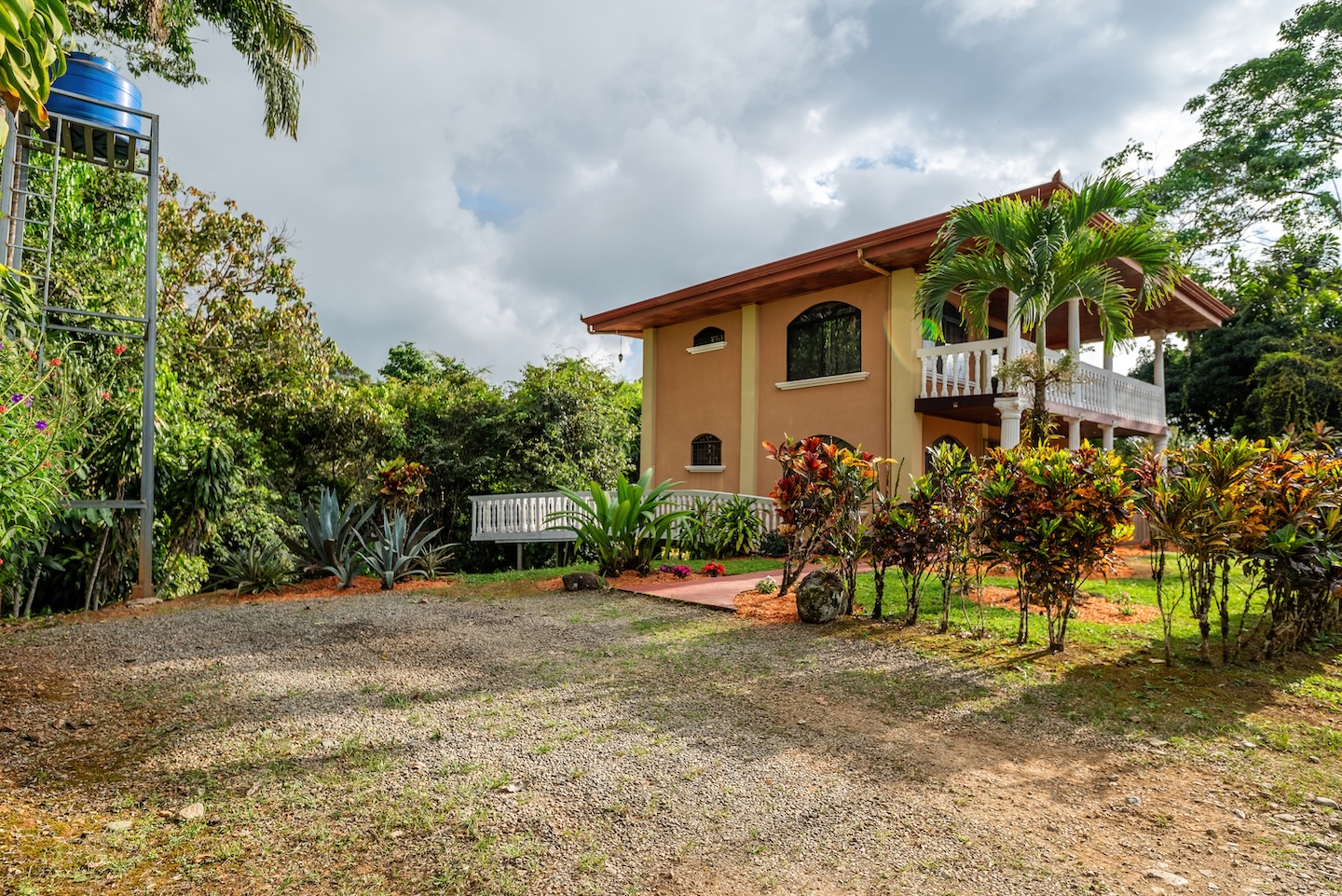 The main facade stands out for its decorative columns and wide arches at doors and windows, elements that enhance its rustic colonial style. The 1,656 m² (approximately 0.40 acres) lot is surrounded by well-maintained tropical gardens, fruit trees, and open spaces ideal for enjoying the climate or developing additional projects. A water tower on the property indicates independence from water supply, a practical advantage in this region.