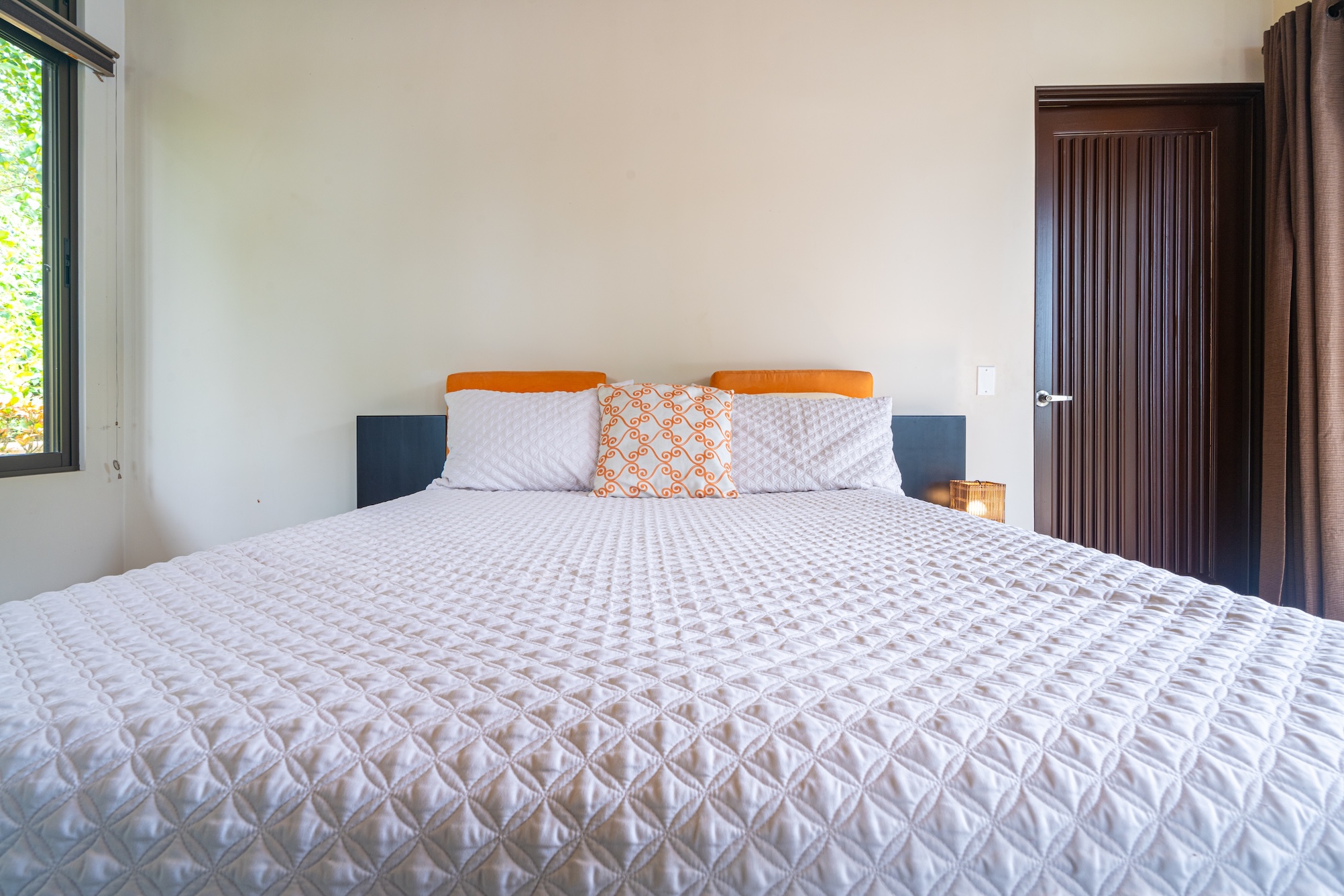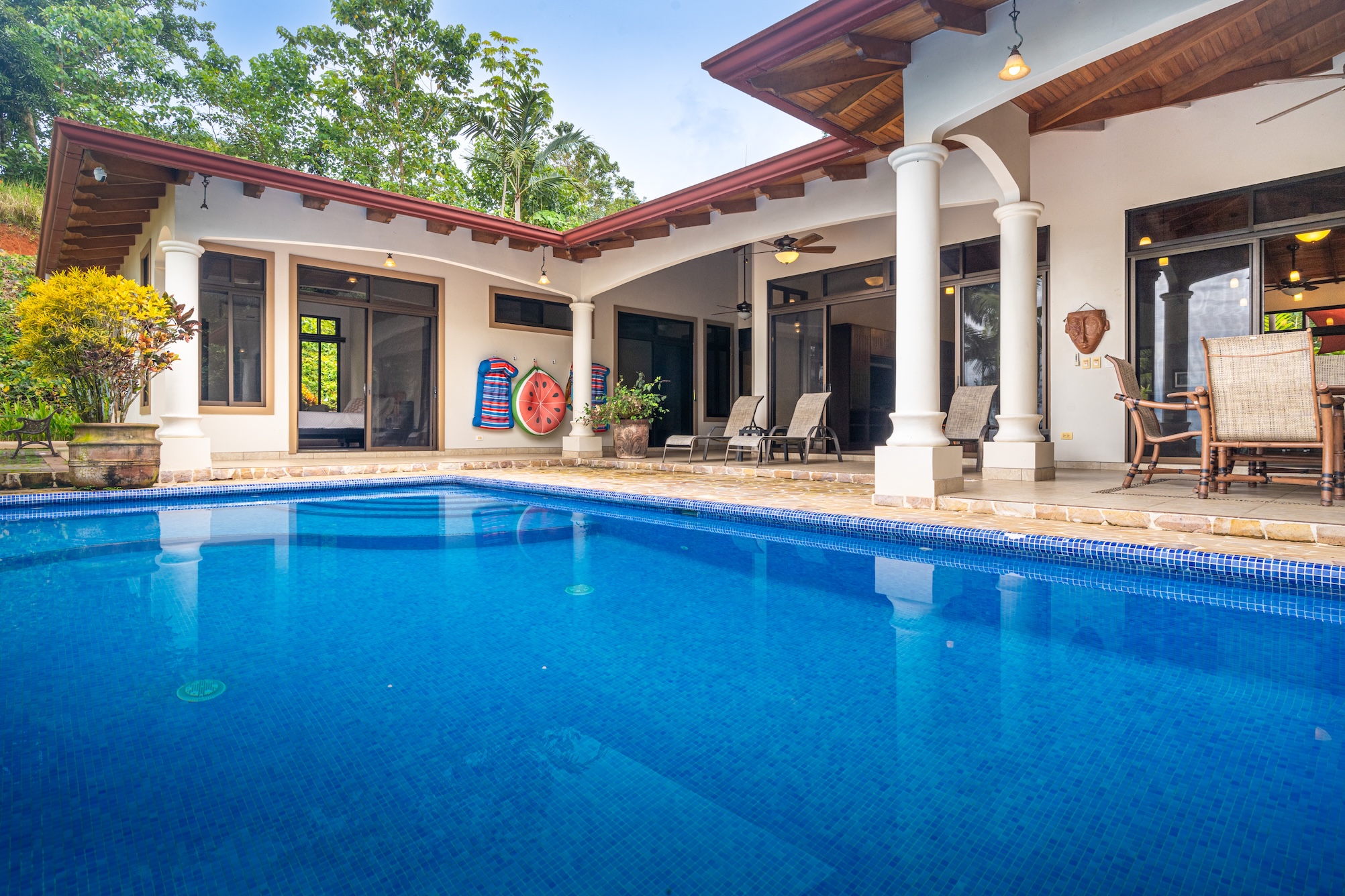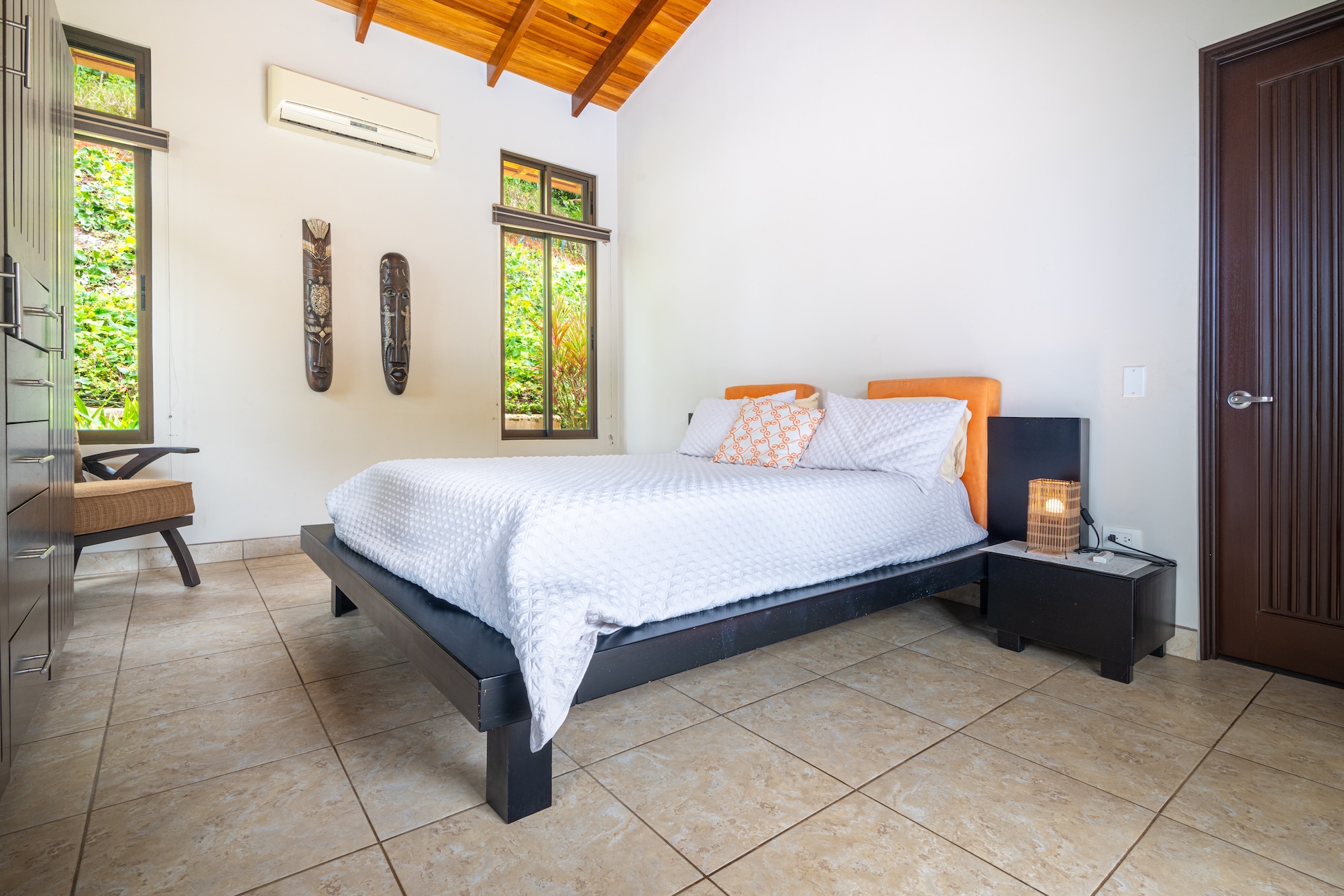 La belleza de esta casa es que los 3 dormitorios están separados del área principal para una paz y tranquilidad absolutas. En el dormitorio principal encontrará una cama tamaño king, un amplio vestidor, un tocador doble y una ducha a ras de suelo. Otras dos habitaciones de invitados tienen vista al área de la piscina y comparten un baño grande con bañera incorporada. ¡A los nietos les encantará!