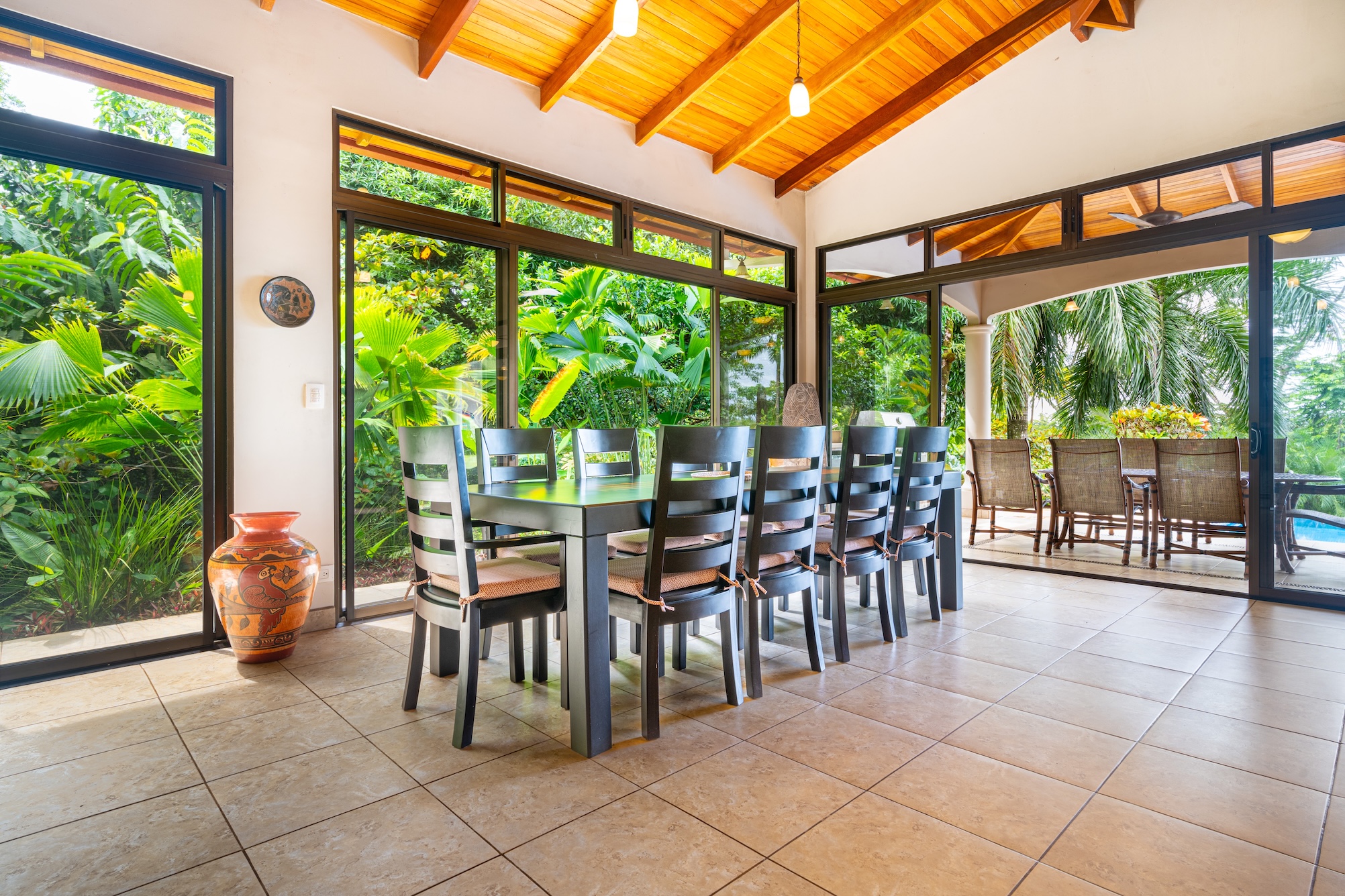 Al entrar, la casa de un solo nivel de concepto abierto cautiva a sus invitados, ya que todo lo que se puede ver son impresionantes vistas al mar, jungla madura y hermosa flora tropical. El diseño ha sido creado cuidadosamente con puertas y ventanas de vidrio circundantes que traen el aire libre al interior. ¡La casa de ensueño para los artistas!