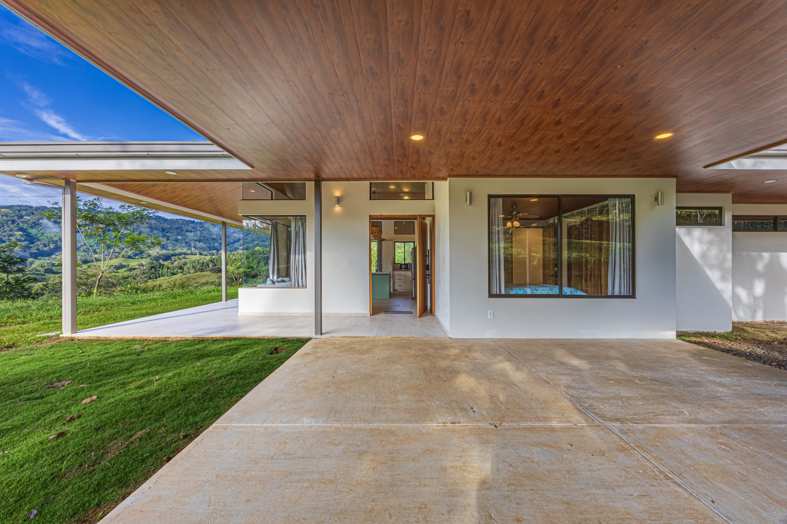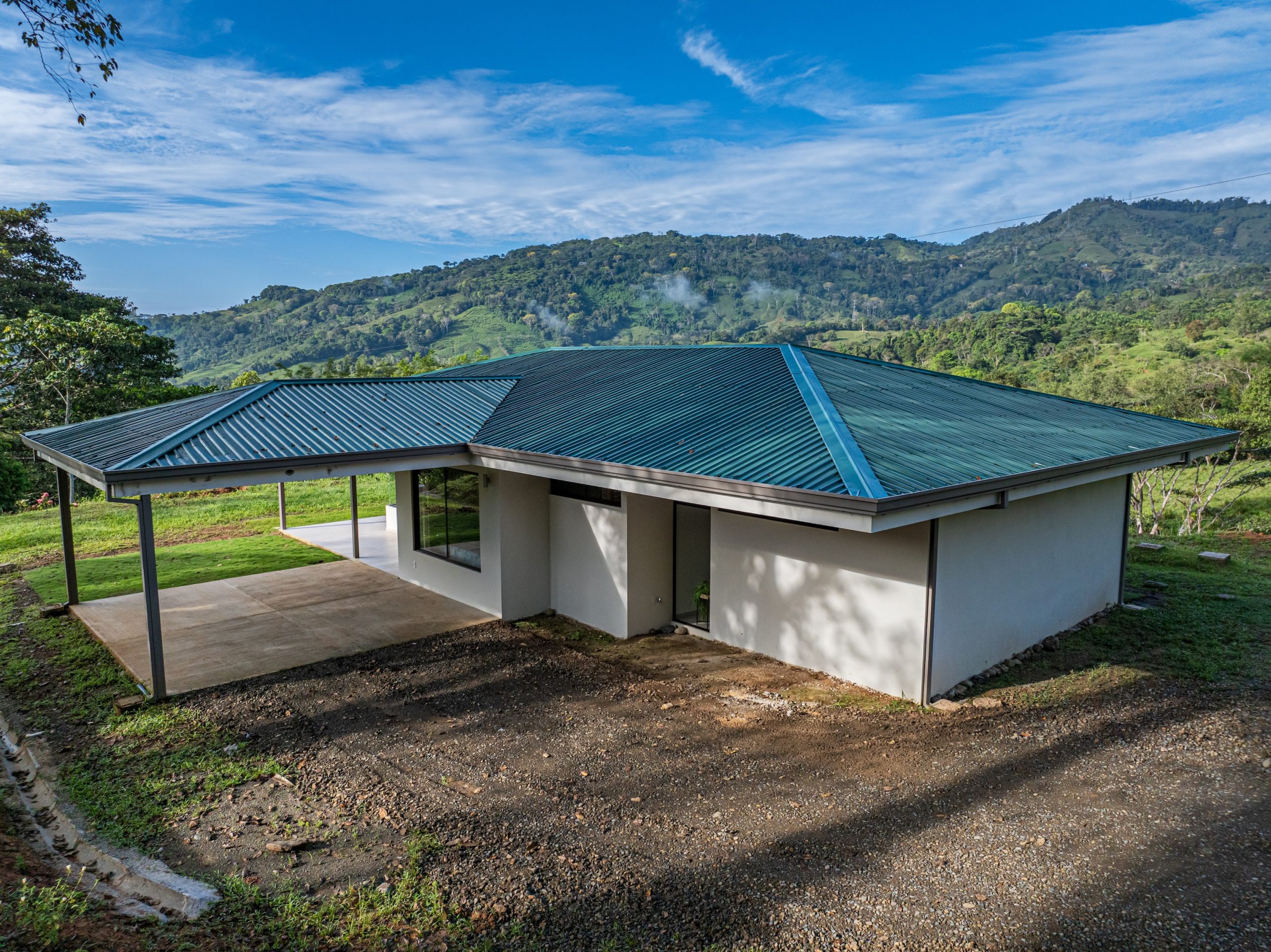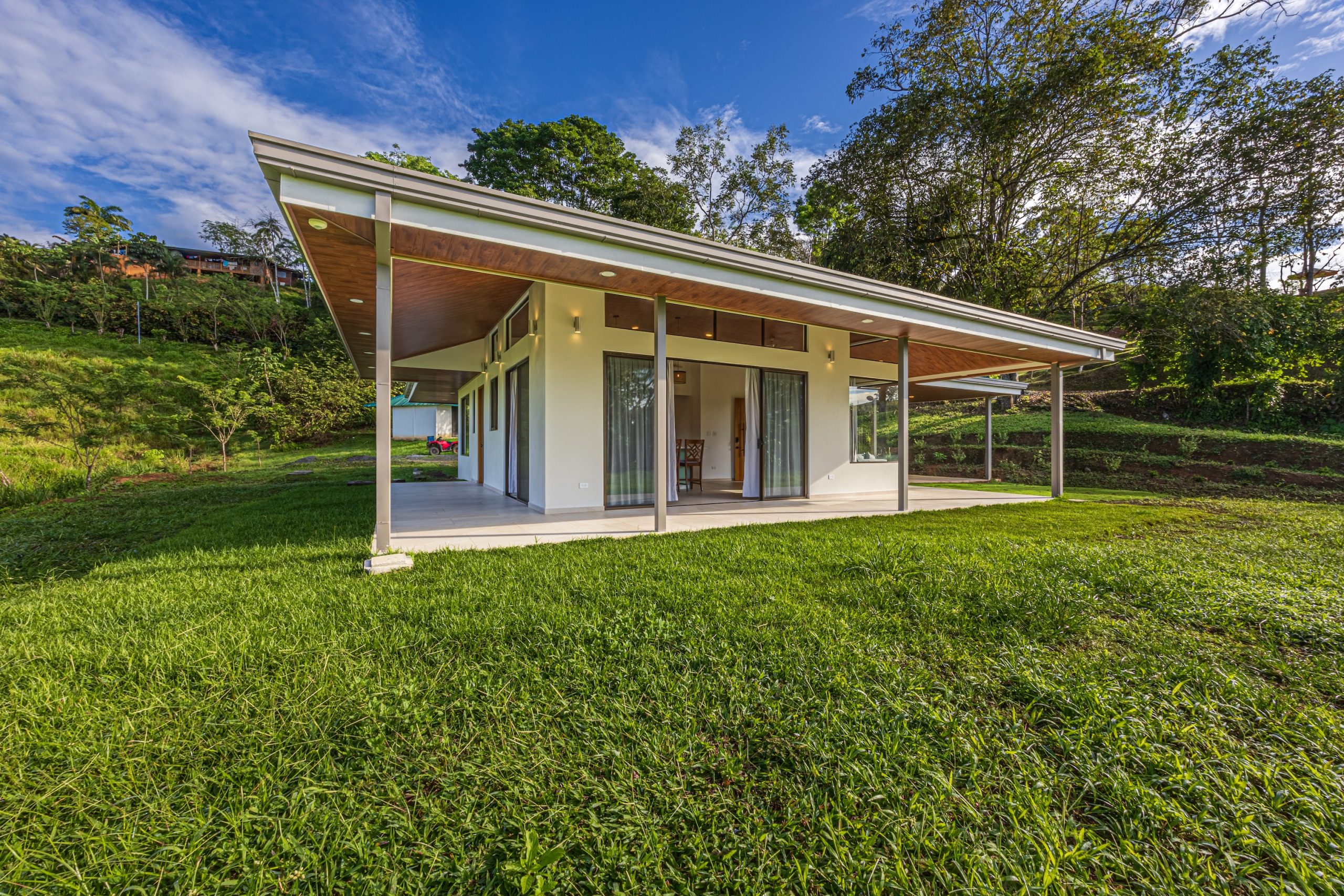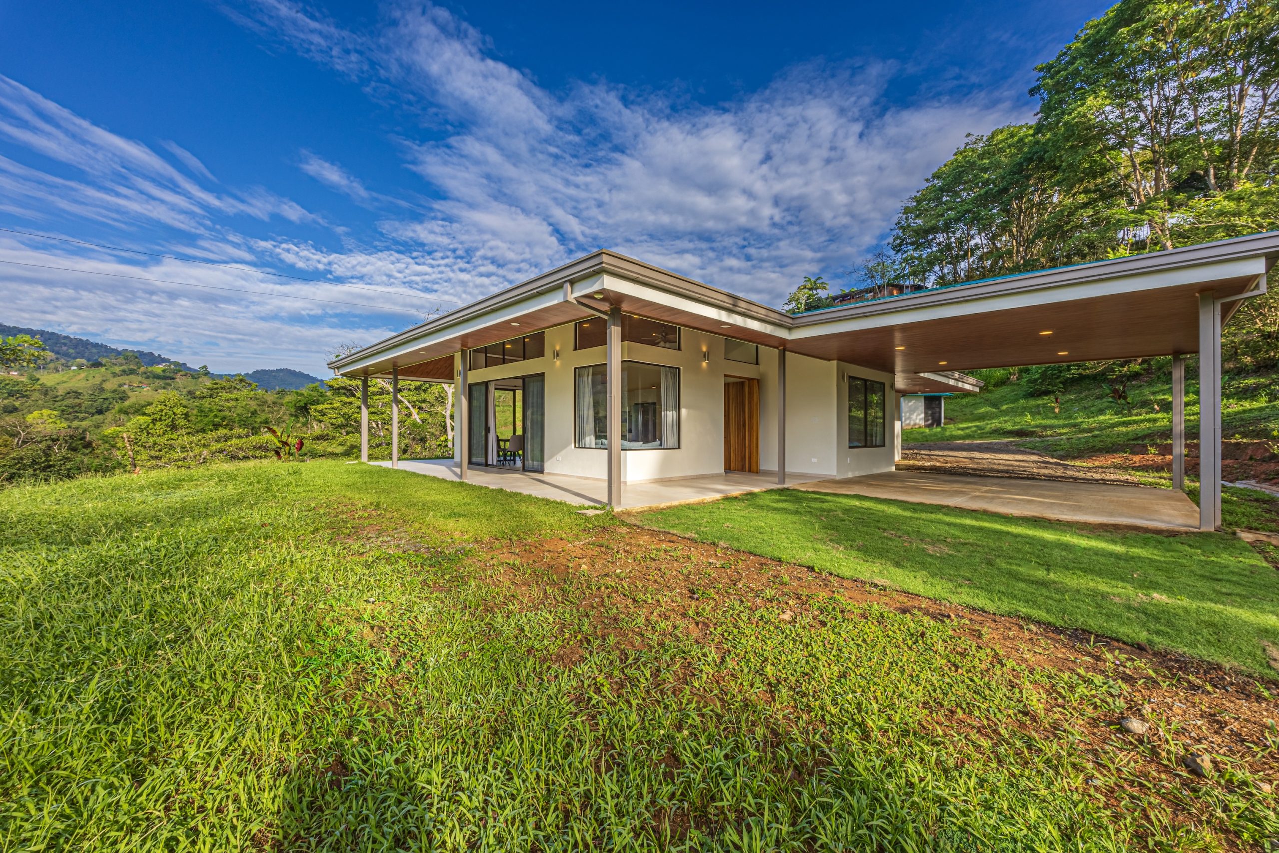 En el exterior, la propiedad ofrece una cochera cubierta que protege los vehículos del clima y amplias áreas verdes ideales para disfrutar del entorno natural del terreno.