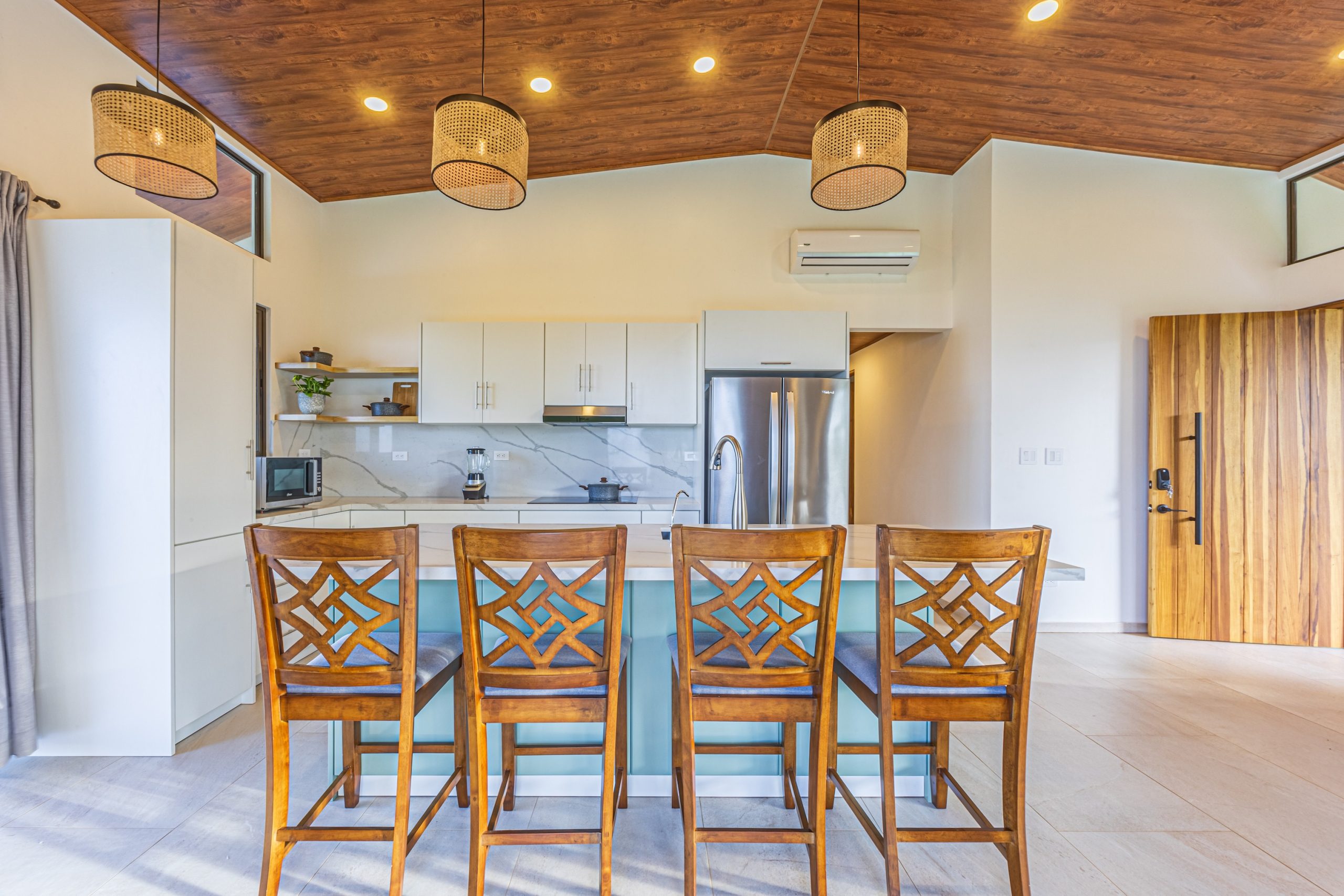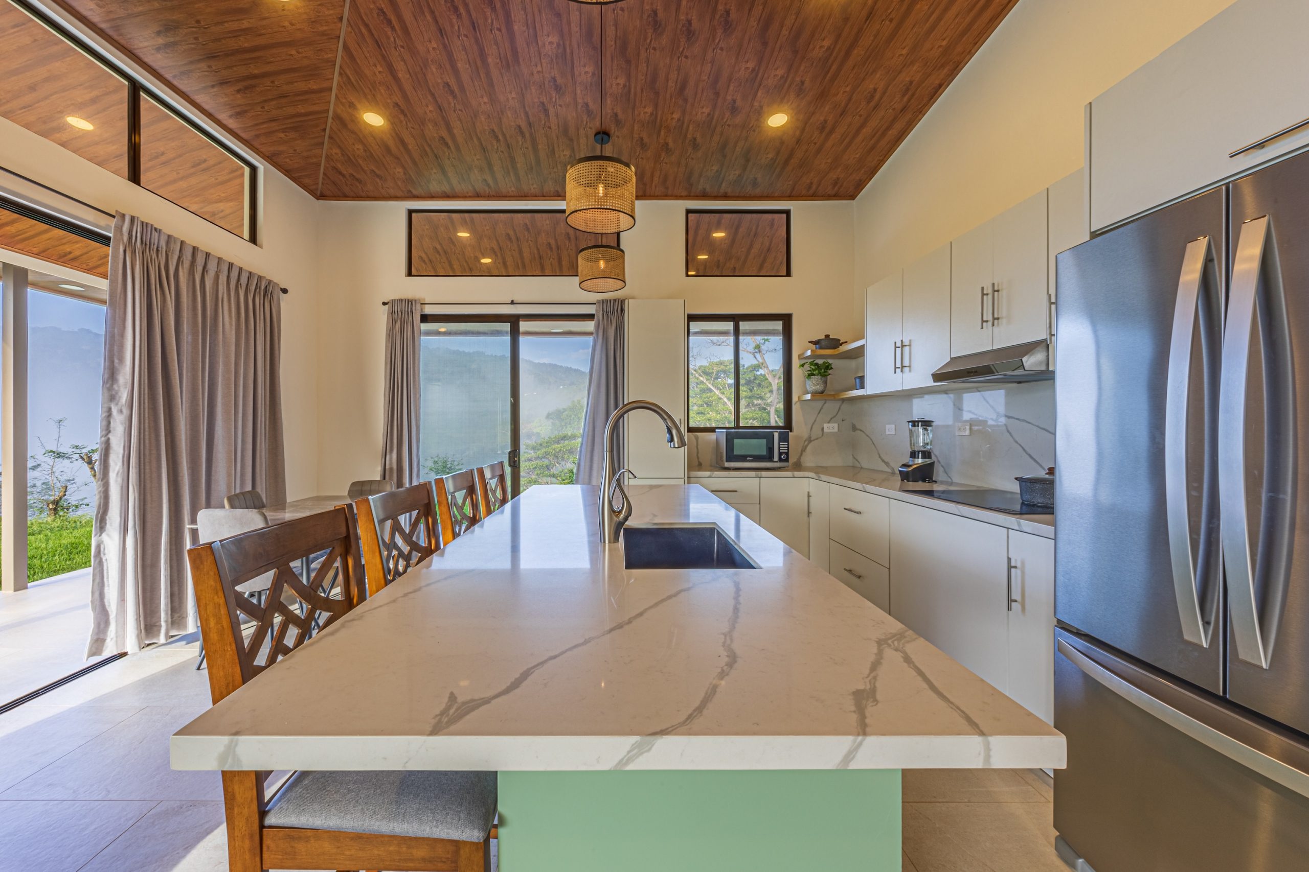 La cocina está completamente equipada con refrigerador, microondas, estufa eléctrica, campana extractora y un práctico mostrador que facilita la preparación de alimentos y el disfrute en familia.
