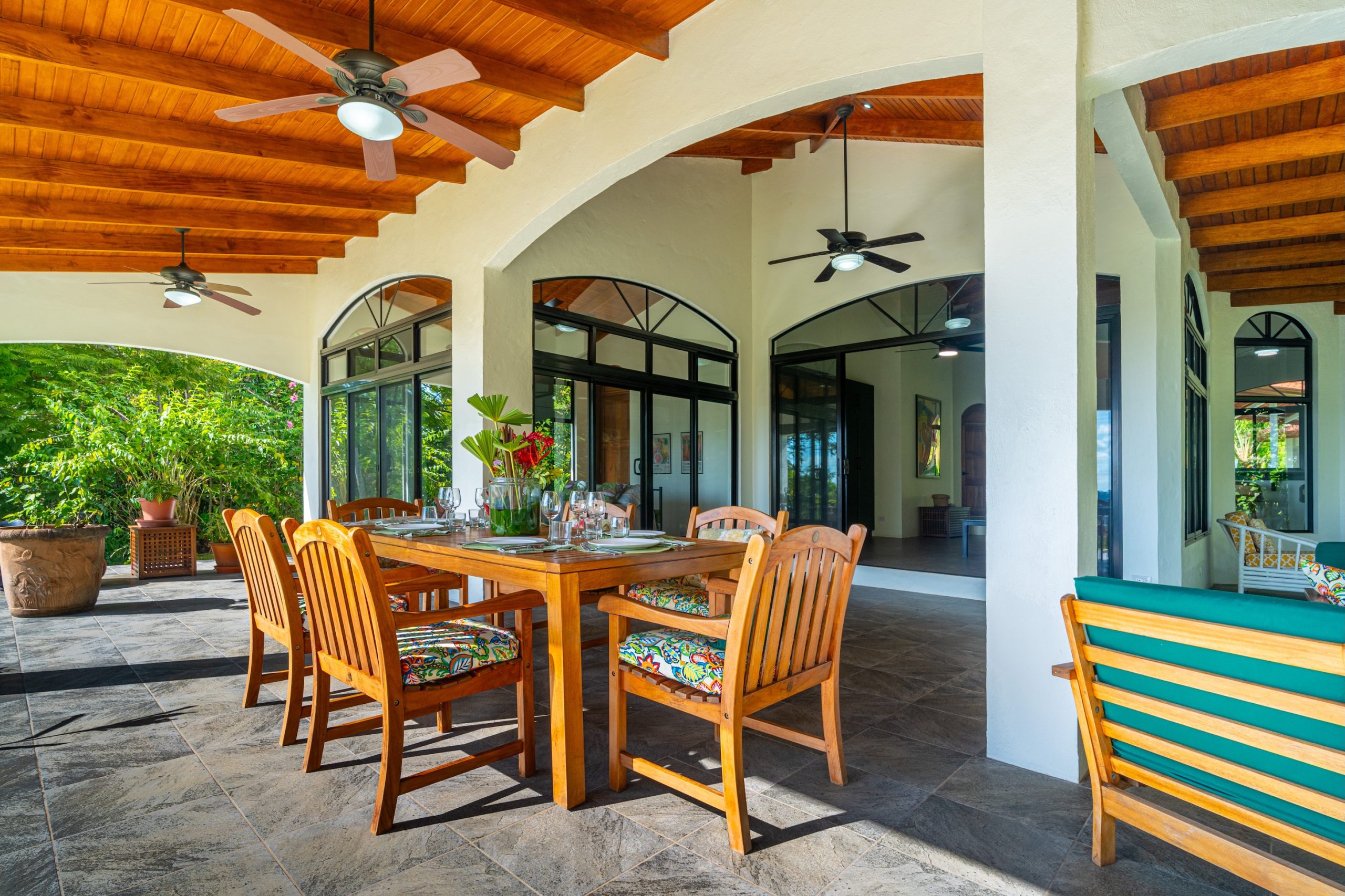 Outdoor living is one of Villa Allamanda’s greatest highlights. A large covered terrace provides the perfect setting for entertaining, featuring a dining area for eight and two separate lounge spaces. Mornings begin with coffee outdoors, accompanied by butterflies, monkeys, toucans, and the peaceful rhythm of mountain life.
