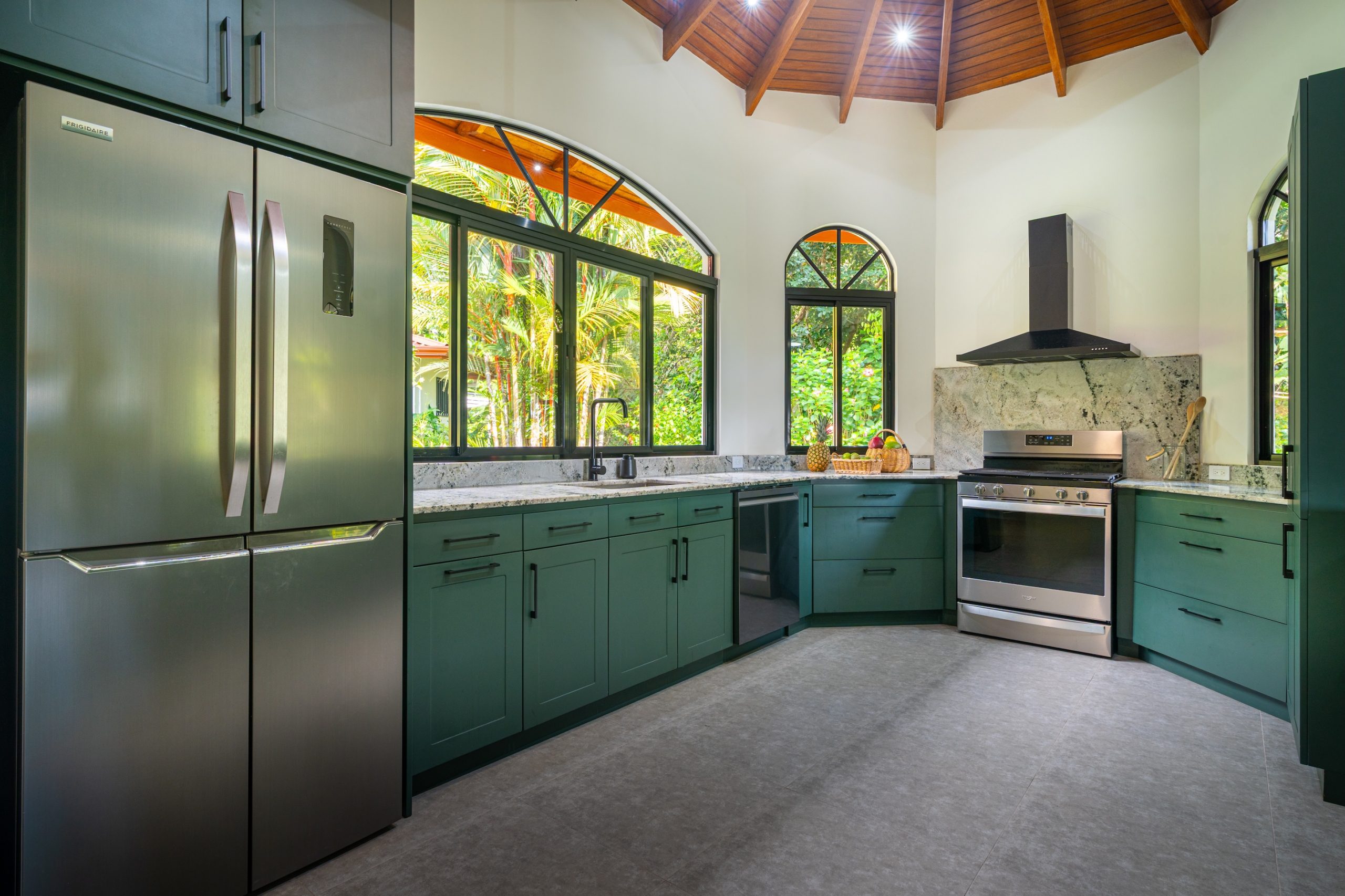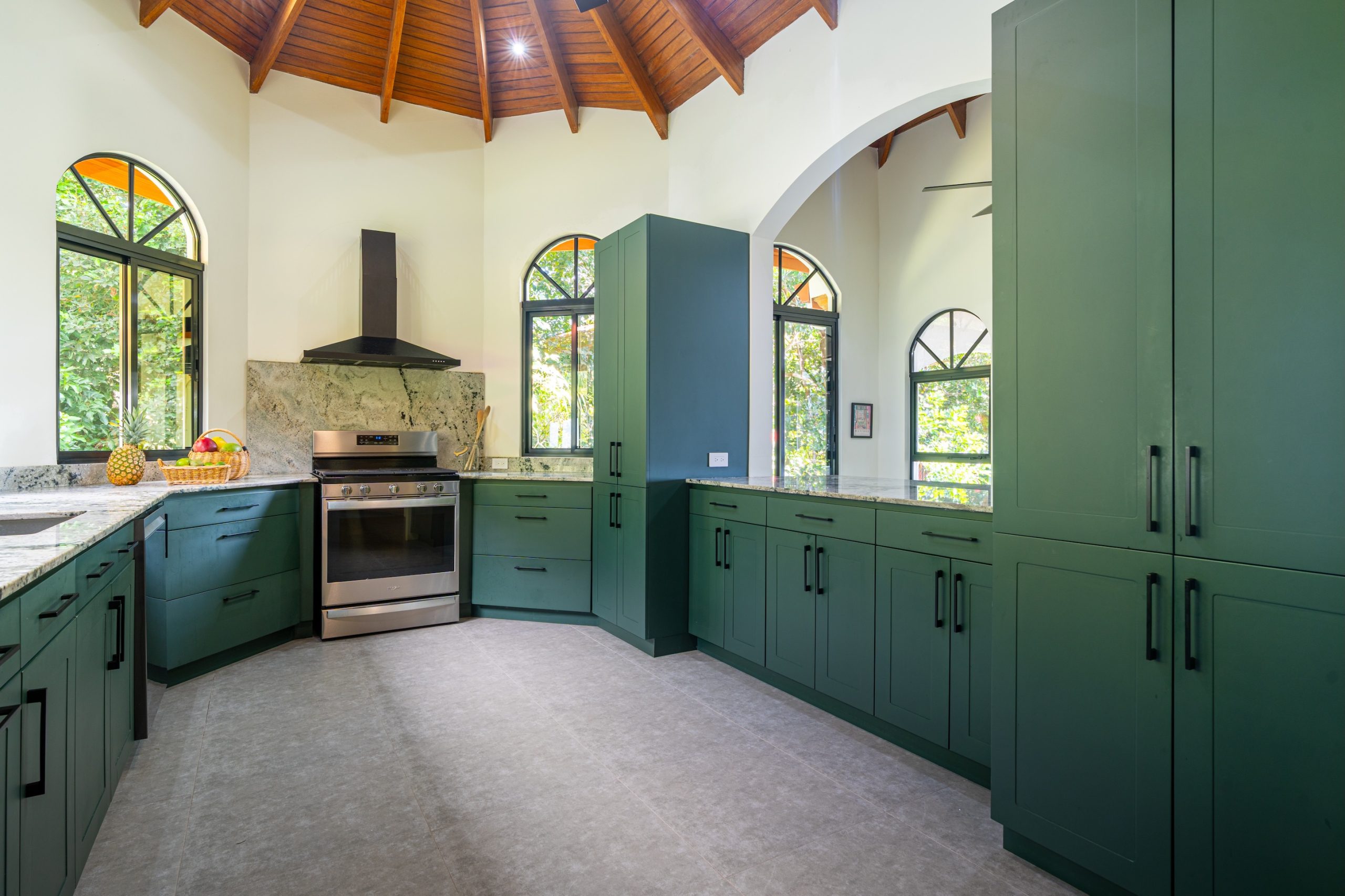Al ingresar, la distribución interior se presenta fluida y bien pensada. A un lado se encuentra la espaciosa cocina estilo chef, equipada con gabinetes hechos a medida, generosas áreas de almacenamiento, electrodomésticos modernos y una barra perfecta para comidas informales o reuniones sociales. Al lado opuesto, dos cómodas habitaciones para invitados disfrutan de vistas a la selva y comparten un baño finamente diseñado, acorde con la calidad general de los acabados.