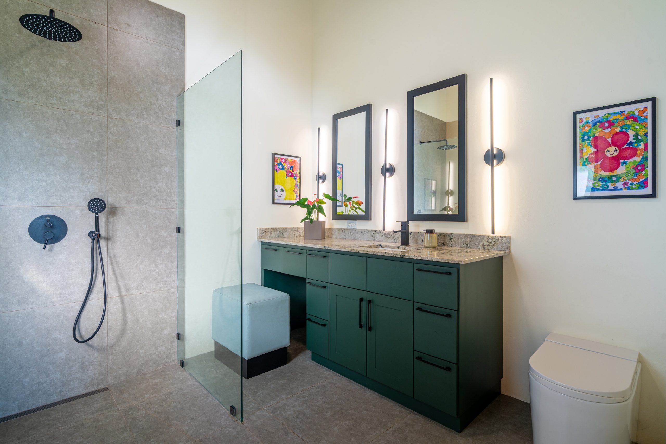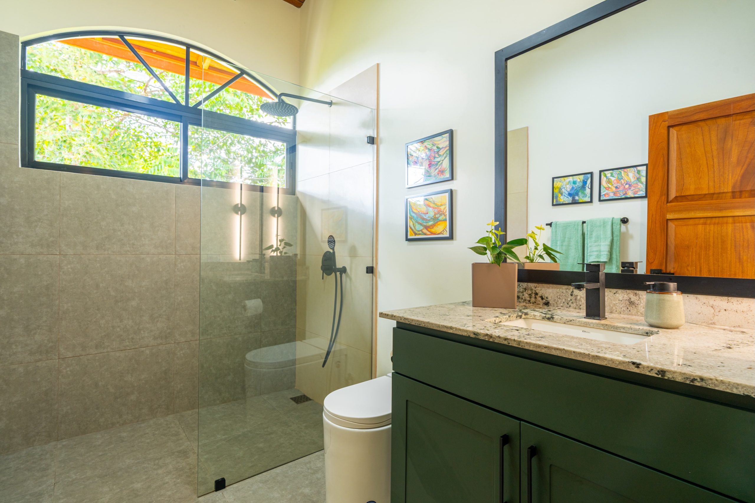 La suite principal es un verdadero santuario privado, con impresionantes vistas al océano y a la naturaleza circundante. Dispone de amplio espacio de almacenamiento y un elegante baño en suite con doble lavamanos, encimeras de granito y una amplia ducha tipo walk-in.
