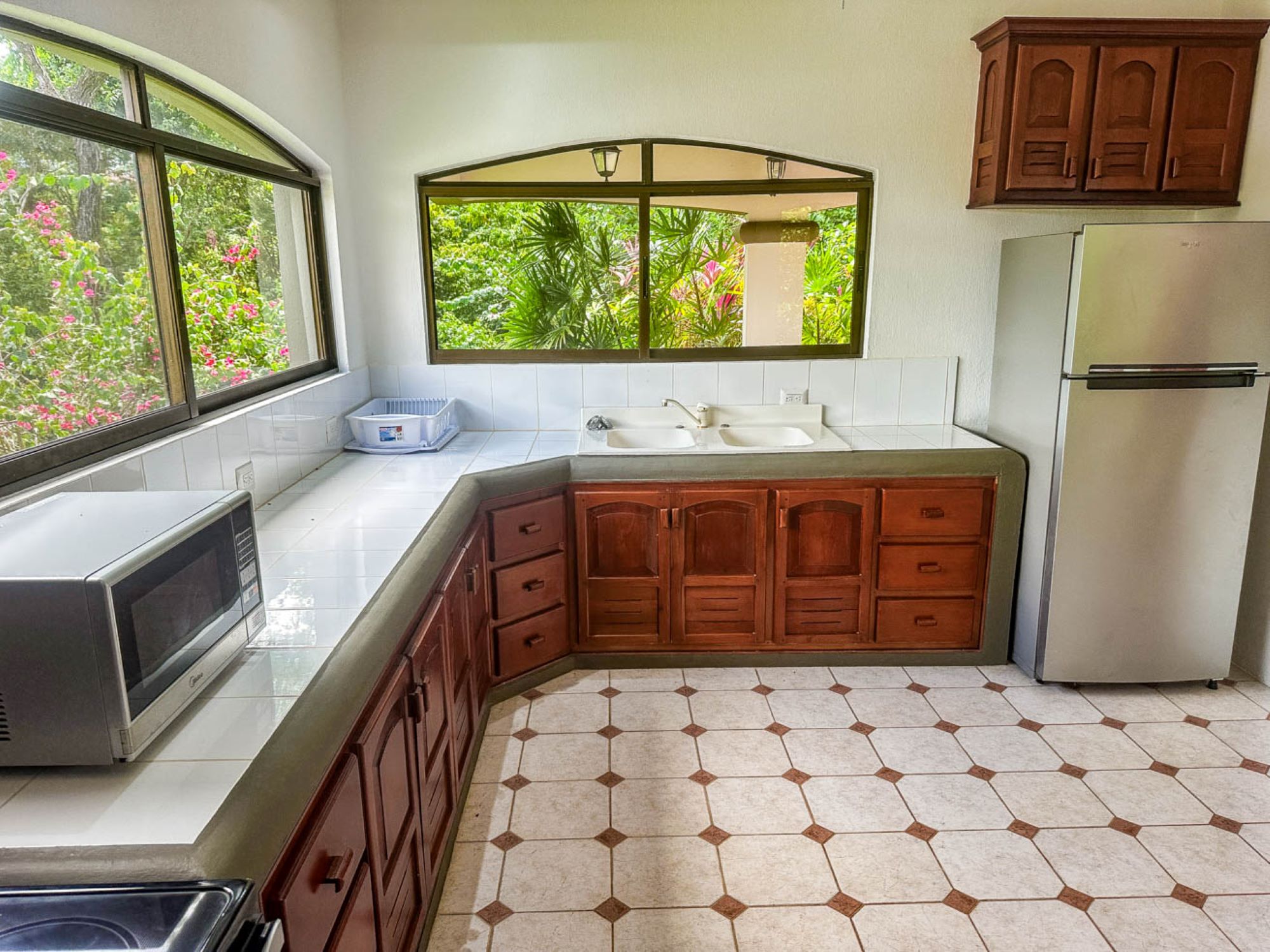 La decoración combina paredes blancas, azulejos brillantes y detalles en madera que aportan calidez, amplitud y luz natural. Toda la villa cuenta con aire acondicionado y ventanales que ofrecen vistas relajantes al jardín y la selva.