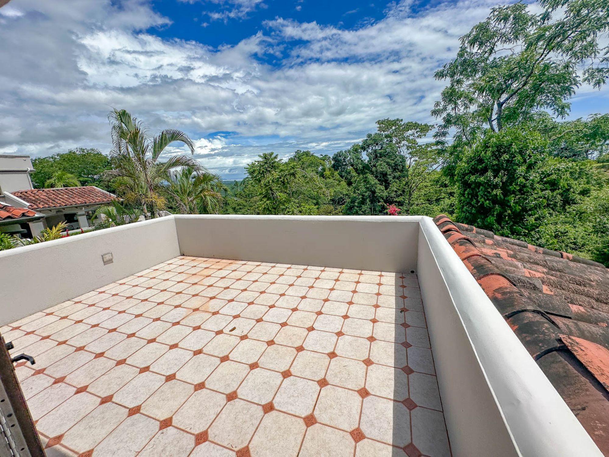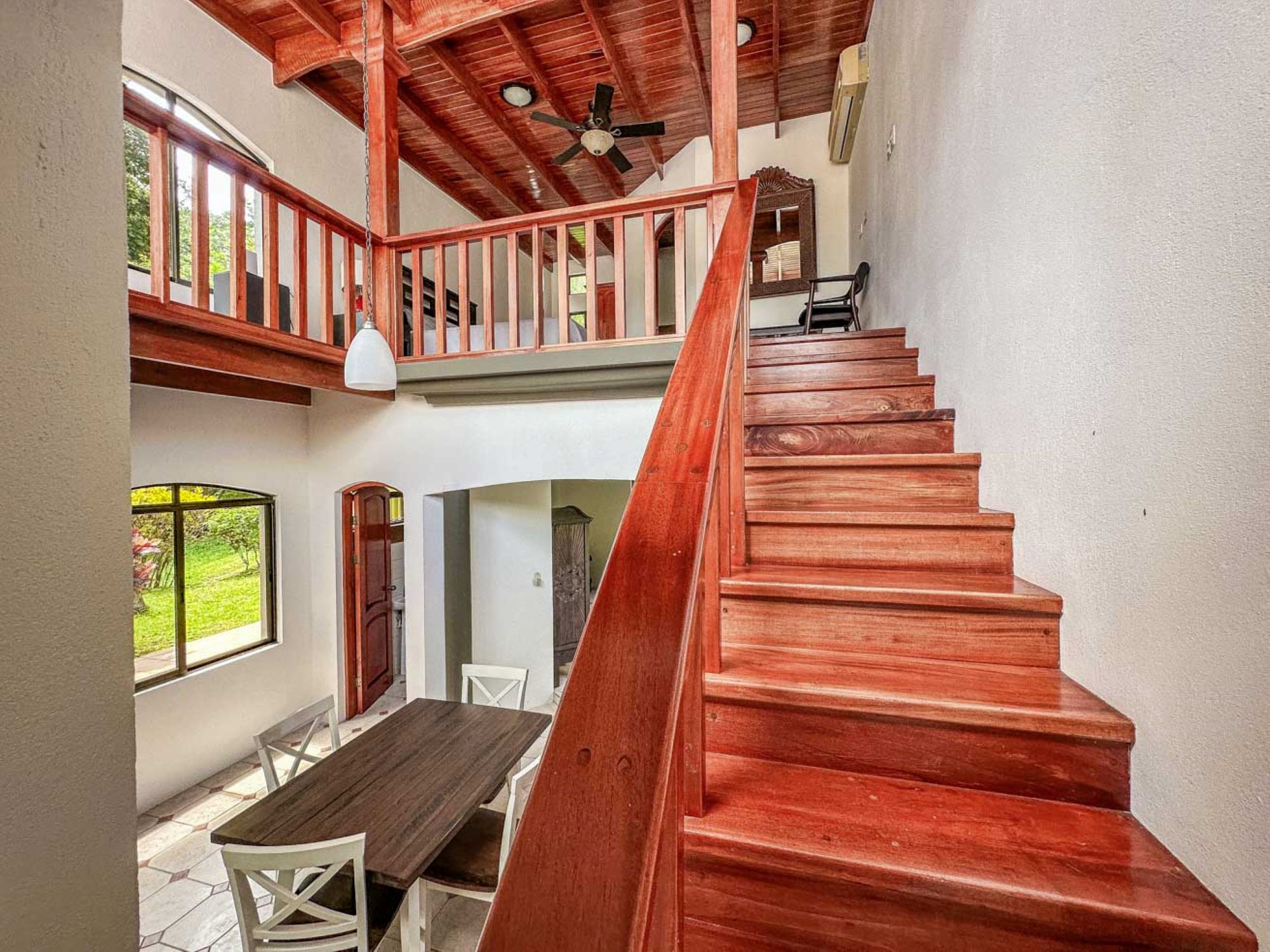 En la planta superior se encuentra el dormitorio tipo loft, un espacio abierto y acogedor con baño privado, ducha y jacuzzi, que se conecta con una espectacular terraza soleada. Este rincón al aire libre es perfecto para comenzar el día con una sesión de yoga, disfrutar de un café al amanecer, relajarse con un cóctel al mediodía o brindar con vino y queso al atardecer. ¡Incluso una barbacoa sería el complemento ideal para esta joya tropical!