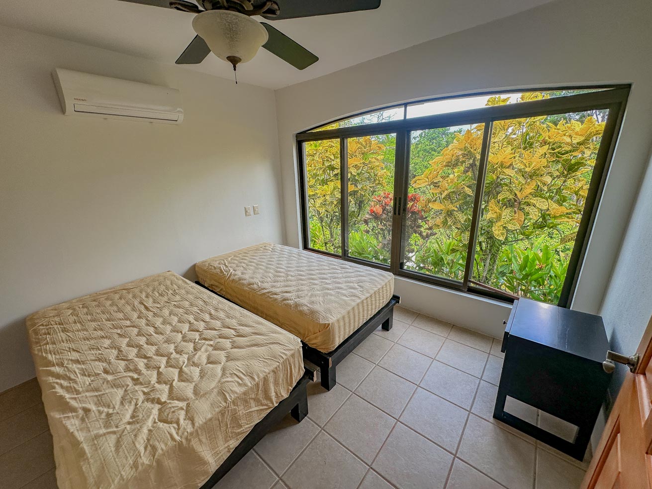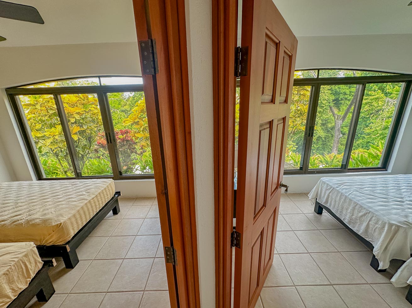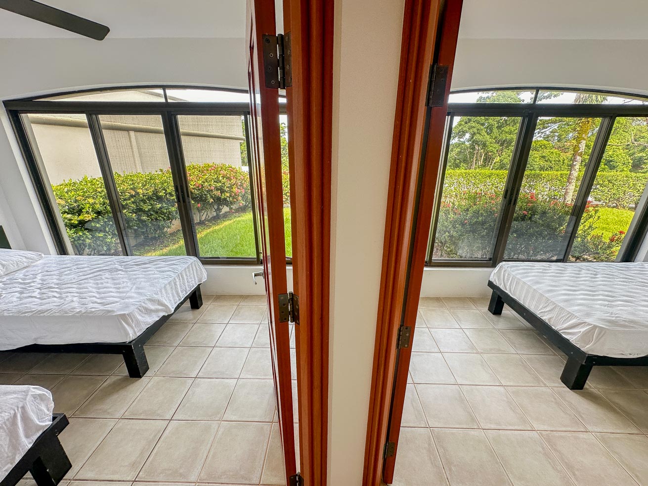 Dos dormitorios amplios, cada uno con ventanales que dan al jardín tropical.