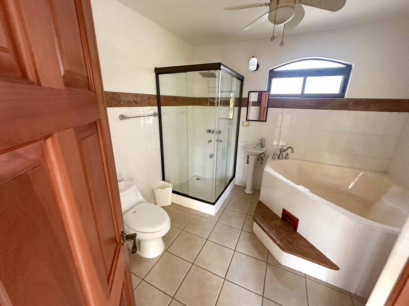 The interiors combine white walls, glossy tiles, and natural wood accents , creating a bright, welcoming, and elegant atmosphere. Air conditioning throughout the villa and windows with jungle views complete this unique residential experience.