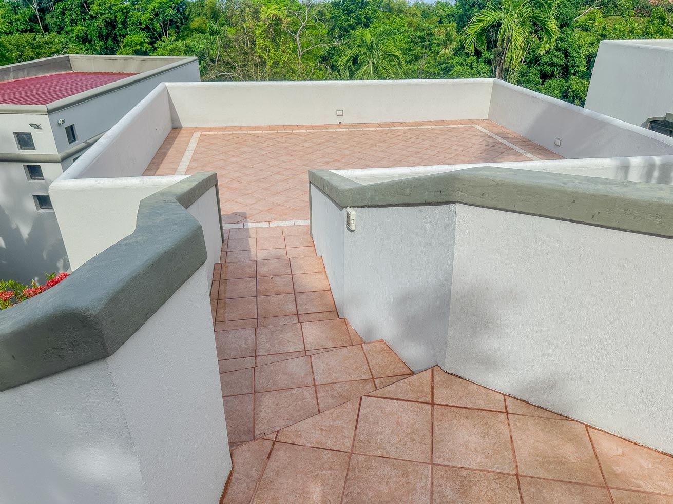 Clubhouse with kitchen, dining room, shower, bathrooms, and rooftop terrace with jungle views.